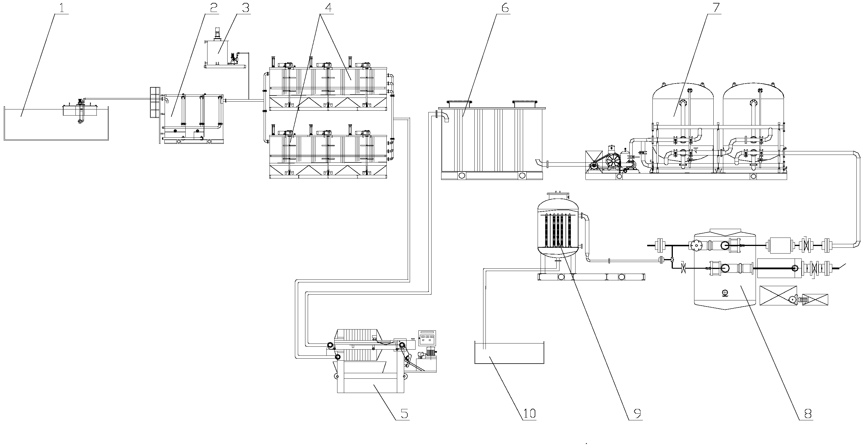 1.一種油田含油污水處理裝置,包括污水池(1)、隔油池(2)、一體化加藥裝置(3)、攪拌箱(4)、污泥壓濾機(5)、中間水箱(6)、一級分子膜過濾器(7)、全自動過濾裝置(8)、二級分子膜過濾器(9)以及清水池(10),其特征在于:污水池(1)通過浮筒、提升泵和管道與隔油池(2)進口相連通,隔油池(2)出口通過管道與2個攪拌箱(4)進口相連通,隔油池(2)與攪拌箱(4)間管道上并連一體化加藥裝置(3),攪拌箱(4)出口通過管道與污泥壓濾機(5)進口相連通,污泥壓濾機(5)出口與中間水箱(6)進口相連通,中間水箱(6)出口與一級分子膜過濾器(7)進口相連通,一級分子膜過濾器(7)出口與全自動過濾裝置(8)進口相連通,全自動過濾裝置(8)出口與二級分子膜過濾器(9)進口相連通,二級分子膜過濾器(9)出口與清水池(10)相連通。
