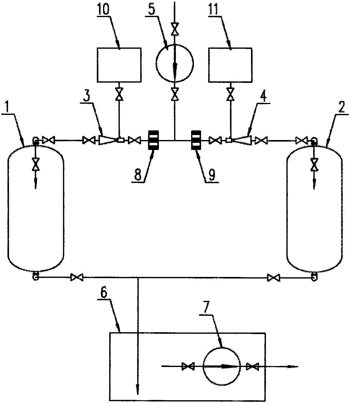 一種離子交換系統(tǒng)廢水處理裝置,包括酸計量箱、堿計量箱、 酸噴射器、堿噴射器、再生水泵、陽床和陰床,酸計量箱通過酸噴射 器連接有陽床,堿計量箱通過堿噴射器連接有陰床,酸噴射器通過流 量計一連接有再生水泵,堿噴射器通過流量計二連接有再生水泵,陽 床和陰床均通過管道連通中和水池,中和水池中安裝有水泵,水泵與 排液管連接,中和水池通過水泵與排液管與外部連接進行排水。