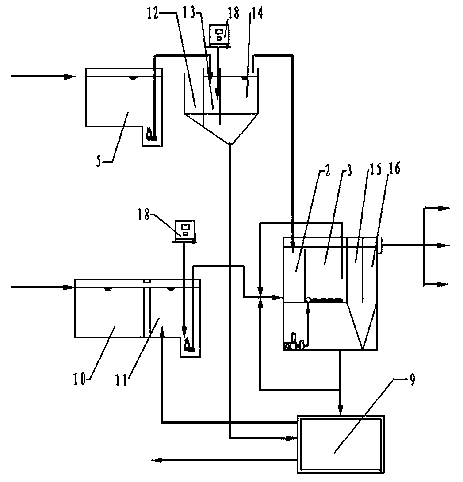 本發明采用的技術方案:使用硅藻精土生物法處理涂料廠廢水的設備,它包括廂體、廠區廢水調節池、生活污水調節池、第一澄清室、第二澄清室、缺氧室、好氧室、污泥脫水室和凈水儲水室,廂體內按照處理工藝分成兩側,其中一側依次設置有缺氧室、好氧室和第二澄清室,另一側依次設置有廠區廢水調節池、生活污水調節池、第一澄清室、污泥脫水室和凈水儲水室,其中生活污水調節池由化糞池和調節池組成,化糞池與調節池通過頂部堰槽連通,第一澄清室由混勻室、第一絮凝室和第一分離室組成,混勻室與第一絮凝室通過提升泵連通,第一絮凝室與第一分離室通過底部連通,第二澄清室由第二絮凝室和第二分離室組成,第二絮凝室與第二分離室通過頂部堰槽連通;缺氧室與好氧室通過頂部的堰槽連通,好氧室與第二絮凝室底部連通,第二分離室與凈水儲水室通過頂部的堰槽連通;廠區廢水調節池和生活污水調節池為兩個獨立的室,調節池與缺氧室通過提升泵連通,調節池與第一絮凝室通過提升泵連通,廠區廢水調節池通過提升泵連通,第一分離室與污泥脫水室通過底部連通,第二分離室與污泥脫水室通過底部連通,缺氧室與第二分離室通過回流管道連通,在混勻室和調節池上方均設置有硅藻精土投料機。