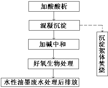 本發(fā)明的目的在于克服現(xiàn)有技術(shù)的不足,提供一種水性油墨廢水的處理方法,它采用酸析混凝沉淀-生物降解組合的工藝來處理水性油墨廢水,處理工藝穩(wěn)定、易于控制,運(yùn)行費(fèi)低,可工業(yè)化、規(guī)模化廣泛應(yīng)用。