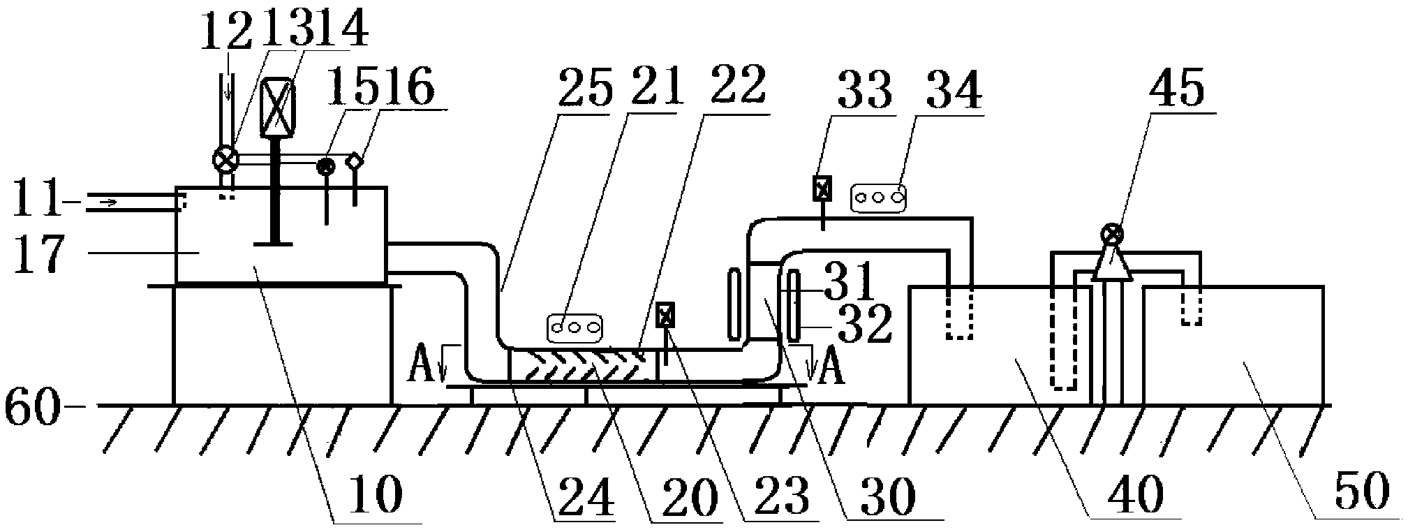 2.根據(jù)權(quán)利要求1所述的皂化廢液預(yù)處理-光催化氧化深處理含醛廢水的系統(tǒng),其特征在于:所述調(diào)節(jié)系統(tǒng)(10)、反應(yīng)系統(tǒng)(20)、光催化系統(tǒng)(30)和沉淀池(40)以及生化處理系統(tǒng)(50)之間通過(guò)管道、法蘭(24)及提升泵連接在一起,且在各個(gè)系統(tǒng)所連接的管道外設(shè)置超聲波防垢器。