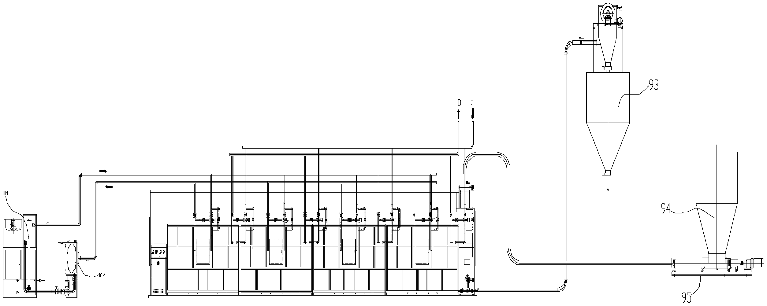 3.根據權利要求2所述的污泥低溫余熱干化機,其特征在于, 所述料輸出裝置通過管道與吸附輸出裝置連接,吸附輸出裝置包括吸 附機和料斗,所述吸附劑通過管道將吸附輸出裝置輸出物料吸附到料 斗內。