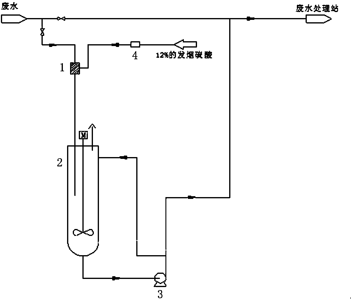 本實(shí)用新型是針對環(huán)己酮氨肟化廢水中高COD和氨氮值的特點(diǎn),而提供的一種用于環(huán)己酮氨肟化廢水的預(yù)處理系統(tǒng)。該系統(tǒng)包括預(yù)混合器、預(yù)反應(yīng)器和出料泵,預(yù)混合器的一個(gè)進(jìn)口接廢水源、另一個(gè)進(jìn)口接發(fā)煙硫酸源,連接預(yù)混合器和發(fā)煙硫酸源的管路上設(shè)有計(jì)量泵;預(yù)混合器的出口接預(yù)反應(yīng)器的進(jìn)口,預(yù)反應(yīng)器的出口接出料泵的進(jìn)口,出料泵的出口分兩路,一路接廢水處理站、另一路接預(yù)反應(yīng)器的回路進(jìn)口。本實(shí)用新型系統(tǒng)是通過發(fā)煙硫酸的強(qiáng)氧化性使廢水中成分復(fù)雜、毒性大的物質(zhì)變成容易被生物降解的物質(zhì),從而減輕了廢水處理中心的處理壓力,滿足了廢水的排放要求。本實(shí)用新型系統(tǒng)具有設(shè)計(jì)科學(xué),結(jié)構(gòu)合理,凈化程度高等優(yōu)點(diǎn),值得推廣使用。