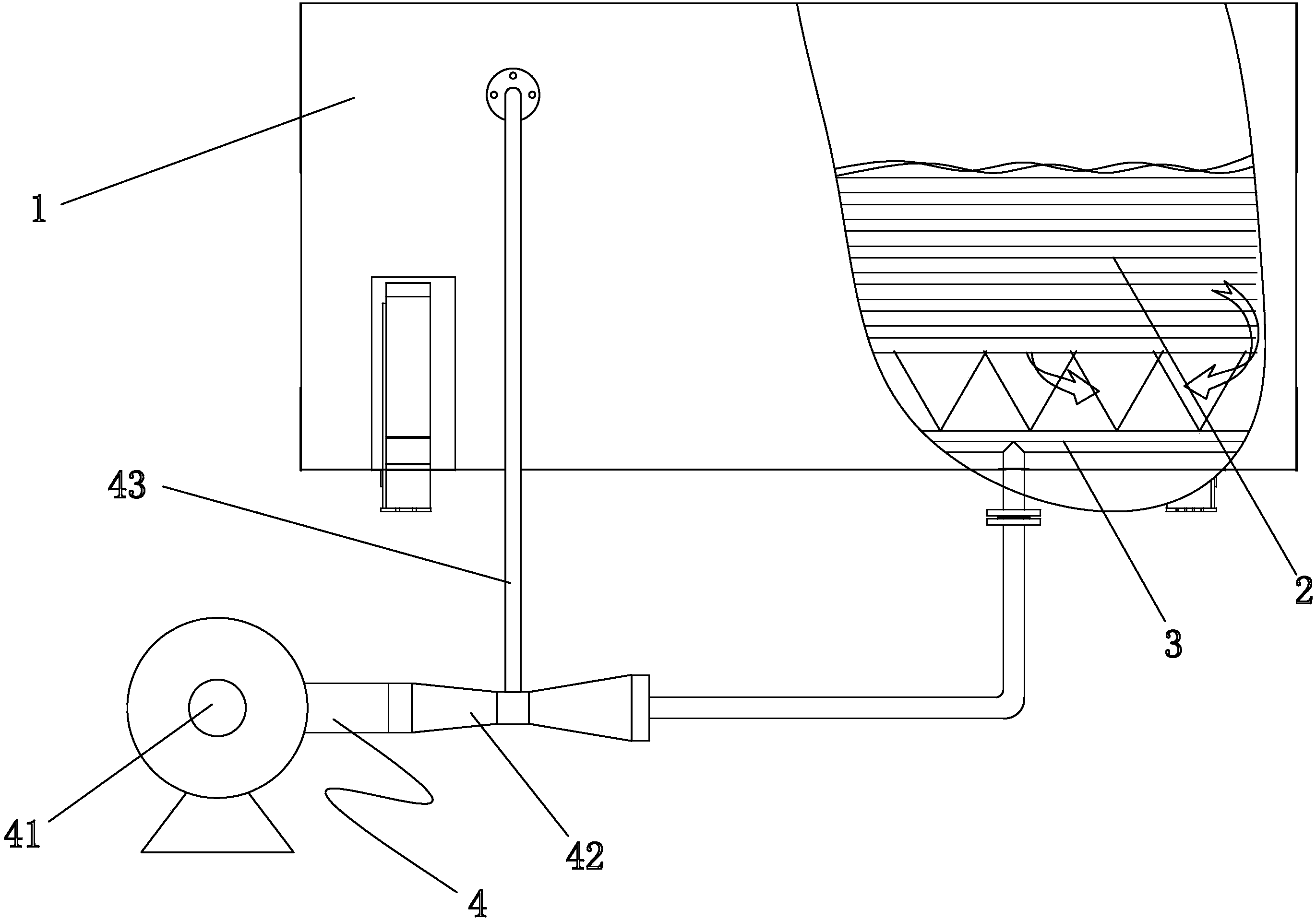 2.根據權利要求1所述的一種應用于高含鹽高結垢率廢水的翻騰蒸發系統,其特征在于所述的射流裝置(4)包括有射流泵(41),在所述射流泵(41)上連接有射流器(42),在所述射流器(42)進氣口上設有進氣管(43),所述進氣管(43)一端與設置在蒸發器(1) 上端的出氣口相連接,所述射流器(42)出口端與所述曝氣裝置(3) 相連接。