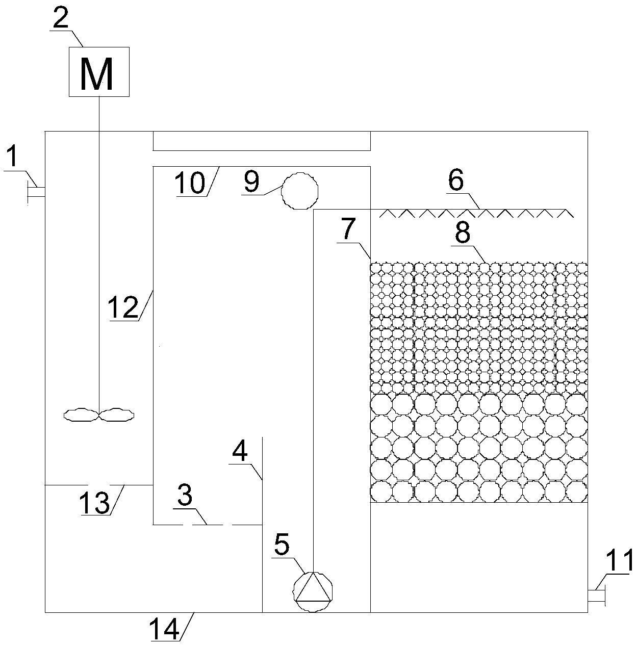 本裝置包括箱體,所述箱體設(shè)有進(jìn)水口和排水口,所述箱體的進(jìn)水口和排水口之間依次設(shè)有進(jìn)水管、沉降區(qū)和過濾區(qū),所述進(jìn)水管內(nèi)設(shè)有攪拌裝置的攪拌部件,所述沉降區(qū)內(nèi)設(shè)有擋泥板將沉降區(qū)分割為左區(qū)和右區(qū),所述進(jìn)水管的底部與沉降區(qū)的左區(qū)底部連通,所述沉降區(qū)的右區(qū)底部設(shè)有污泥泵,所述過濾區(qū)內(nèi)填充有濾料層,所述污泥泵的出料口設(shè)置在過濾區(qū)濾料層的上方,所述沉降區(qū)的上側(cè)設(shè)有溢流口與外界連通。本實(shí)用新型污泥脫水效果更好、占地面積小、濾料不堵塞,故障率低。