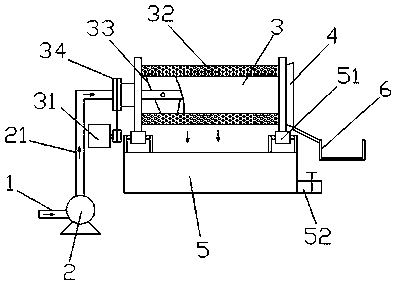 本實用新型的有益效果是:本實用新型指出的一種水刺工藝廢水過濾裝置,廢水通過第二廢水供液管進入過濾滾筒,在過濾滾筒旋轉的過程中,廢水中的水分通過漏水孔流入下方的回水池,而廢水中的纖維被過濾網阻擋,堆積的纖維在旋轉的過程中隨螺旋設置的纖維導向擋板而滑出過濾滾筒,最終進入纖維回收箱,以便二次利用,而回水池中的廢水沒有了木纖維和無紡布纖維,減少了后續廢水的處理成本。