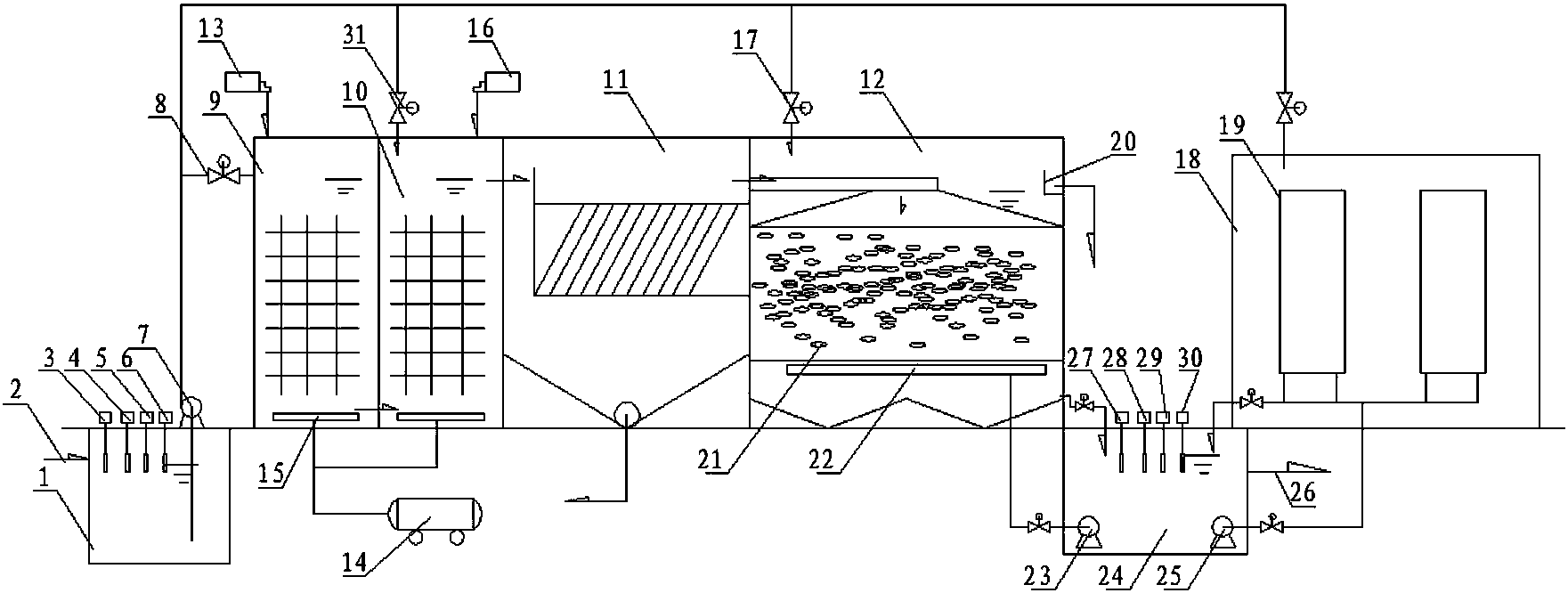 所述生物填料池的底部設置有反沖洗管,所述反沖洗管連通有濾池反沖洗泵,所述濾池反沖洗泵與清水池連通。