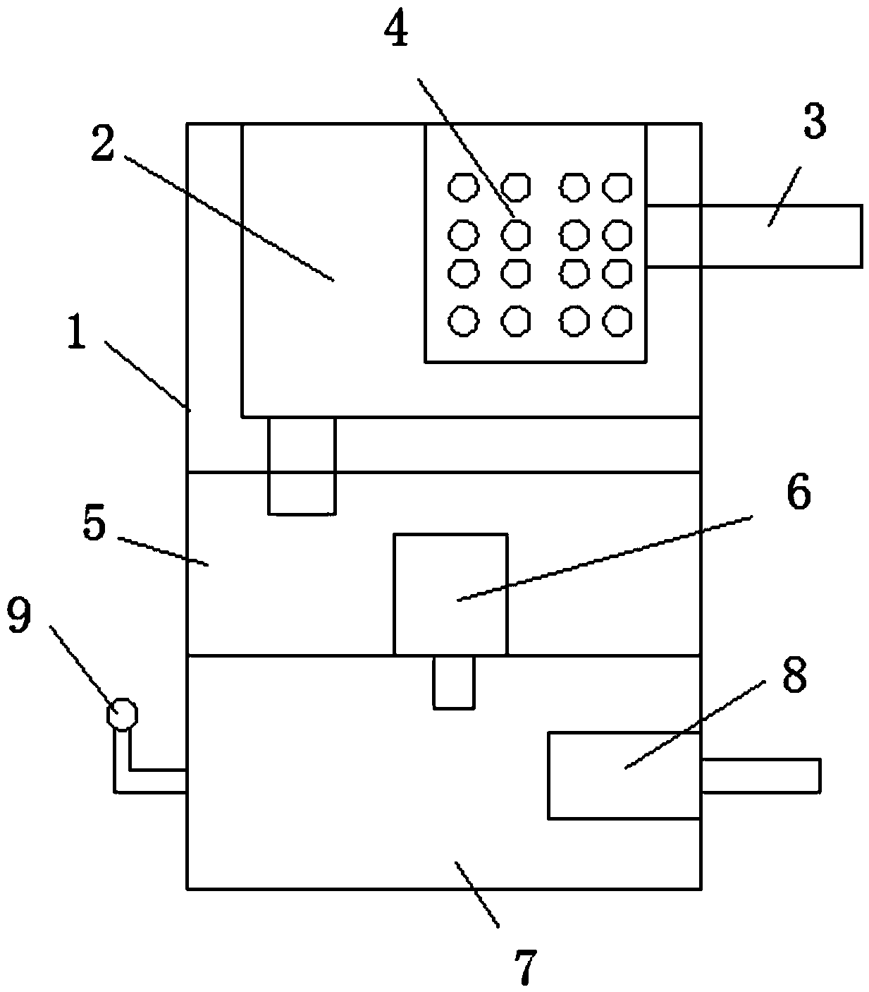 一種鋁箔加工車間用污水處理裝置,包括殼體,其特征在于:所述殼體上端設有上水箱,所述上水箱的側壁上設有進水管,所述進水管的端部安裝有過濾網,所述上水箱通過管道連接下方的中水箱,所述中水箱的下方的出水口處設有填充有石英砂和木屑的過濾芯,所述中水箱的下方連通底水箱,所述底水箱的出水口處設有活性炭過濾芯。