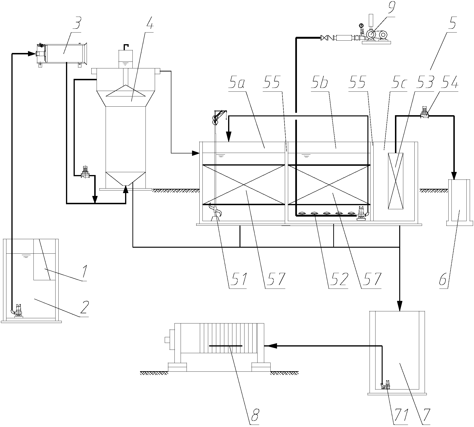 3.根據(jù)權(quán)利要求2所述的果凍廢水處理系統(tǒng),其特征在于:所述EGSB反應(yīng)器(4)、缺氧段(5a)、好氧段(5b)和MBR段(5c)分別通過管路連接有同一個污泥池(7),在該污泥池(7)的底部設(shè)有污泥泵(71),該污泥泵(71) 的污泥出口通過污泥管連接有壓濾機(jī)(8)。