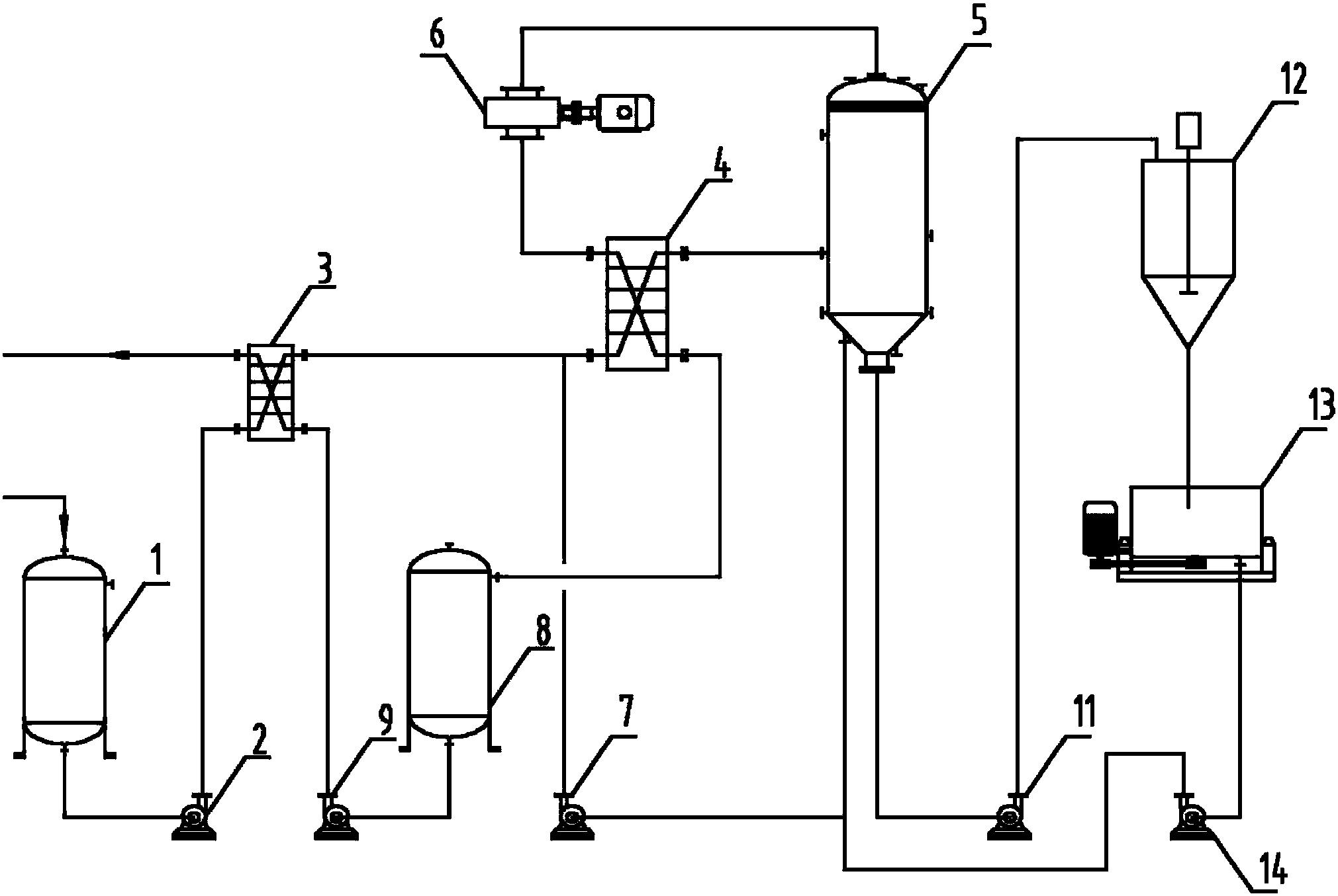 作為本發明的一種有優選的方案,所述主換熱器和分離器通過管道連接構 成一閉合回路,在管道上設有一循環泵,預熱后的硫酸鎳廢水進入主換熱器與 加熱蒸汽換熱,獲取熱量的硫酸鎳廢水進入分離器閃蒸分離出二次蒸汽和濃縮 液,濃縮液重新進入閉合回路通過循環泵作用,不斷經過主換熱器和分離器閃 蒸分離作用,最終達到過飽和狀態從分離器泵入冷卻結晶器進行結晶。