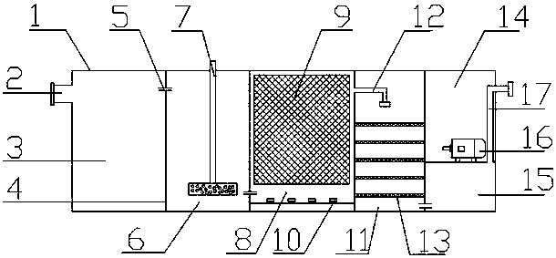 1.一種一體化污水處理設備,包括主體(1)、進水口(2)、沉淀池(3)、隔板(4)、溢流口(5)、生物反應池(6)、氣提裝置(7)、接觸氧化池(8)、接觸填料(9)、曝氣盤(10)、過濾池(11)、導流管(12)、過濾膜(13)、風機室(14)、消毒池(15)、風機(16)和出水管(17),其特征在于:所述主體(1)內部設置有多道隔板(4)將主體分為沉淀池(3)、生物反應池(6)、接觸氧化池(8)、過濾池(11)、風機室(14)和消毒池(15),所述主體(1)左上角設置有與沉淀池(3)相連通的進水口(2),所述沉淀池(3)和生物反應池(6)、生物反應池(6)和接觸氧化池(8)之間、過濾池(11)和消毒池(15)之間的隔板(4)上均設置有溢流口(5),所述生物反應池(6)內設置有氣提裝置(7),所述接觸氧化池的中央位置橫式懸掛固定有接觸填料(9),所述接觸填料(9)的下方位于接觸氧化池(8)的底部均勻分布有多個曝氣盤(10),所述導流管(12)固定在接觸氧化池(8)和過濾池(11)之間的隔板(4)上并和接觸氧化池(8)與過濾池(11)相連通,所述過濾池(11)內橫式固定有多個過濾膜(13),所述風機室(14)內設置有風機(16),所述出水管(17)為L型并和消毒池(15)與主體(1)外部相連通,所述出水管(17)位于風機室(14)右端。