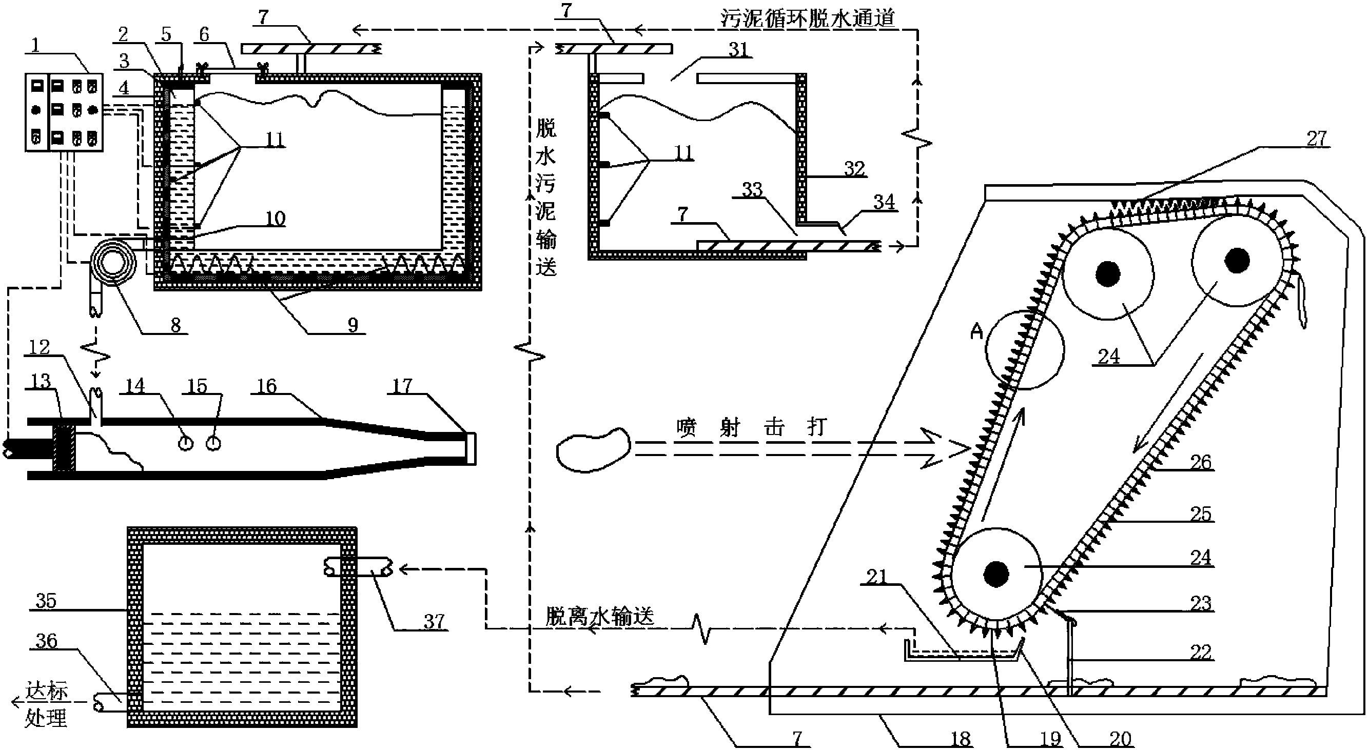 所述的擊打分流履帶,為一條順時針循環(huán)的履帶,垂直傾斜30°,設有履帶設有傳動電機、傳動輪、錐形釘齒、導游槽、刮泥板和引流板,傳動電機帶動履帶順時針循環(huán)轉動,錐形釘齒均勻垂直布設于履帶上,當污泥經(jīng)噴射作用擊打在履帶上后,錐形釘齒能在增加污泥結構破壞力的同時減小污泥濺射程度,并能防止污泥下滑,此時污泥保水結構受到第三次破壞,擊打后,污泥的泥水產(chǎn)生分離,履帶上劃設豎向和斜向交縱的液體導游槽,便于脫離水分的向履帶邊緣并向下分流,污泥隨著履帶上行,履帶四周用鋼板包圍,保證少量濺射污泥無法逃離,在履帶正上方的鋼板與履帶之間保留漸縮縫隙作為擠壓脫水口,在位于擠壓脫水口處的履帶正上方的鋼板底面設有尖齒,其與履帶釘齒正好錯開,上行污泥在履帶的帶動下在擠壓脫水口處進行擠壓進一步脫水,脫除的水分順液體導游槽向履帶下方流動,擠壓后的泥餅在重力作用下從履帶掉落到位于履帶下方的鋼板上所設置的傳送帶上。所述的擊打分流履帶,其主體是一條順時針循環(huán)的鋼制履帶,寬度50cm,垂直傾斜30°。長3cm的錐形釘齒均勻垂直布設于鋼制履帶上。正上方的鐵板與履帶之間保留最小處0.2cm的漸縮縫隙。刮泥板和引流板設于履帶正下方,刮泥板可將粘附在履帶上的污泥刮落,引流板將分離的液體引流至履帶下方的承接水槽內(nèi)最終排至廢水池內(nèi)。