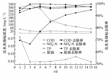 通過SBR間歇式活性污泥法, 含油廢水處理15 d后, 出水各指標濃度和去除率見圖 4, 實驗組COD、NH4+-N、TP的平均去除率分別為96.49%、96.88%、99.15%, 石油去除率為92.43%, 不加入石油降解菌的對照組去除率為53.80%.菌株JC-106在SBR生物反應器中生長情況見圖 5, JC-106在廢水中的初始濃度為2.66×109 cfu·mL-1, 在處理含油廢水1~15 d的時間內(nèi), JC-106數(shù)量維持在4.8×1010~1.0×1011 cfu·mL-1.