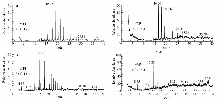 JC-106接種于原油濃度為3000 mg·L-1基礎培養(yǎng)基, 分別于15和35 ℃培養(yǎng)15 d, 對原油降解率分別為58.18%和41.61%.GC-MS分析發(fā)現(xiàn)原油中以直鏈烷烴為主, 包括正十四烷、十五烷、十六烷、十七烷、十九烷、二十烷、二十一烷、二十四烷、二十七烷、二十八烷、四十四烷.在35 ℃培養(yǎng)時, 對直鏈烷烴、植烷、姥鮫烷的降解率分別為98.16%、54.60%和85.46%, 15 ℃培養(yǎng)時的降解率分別為96.13%、48.61%和86.83%(圖 3).
