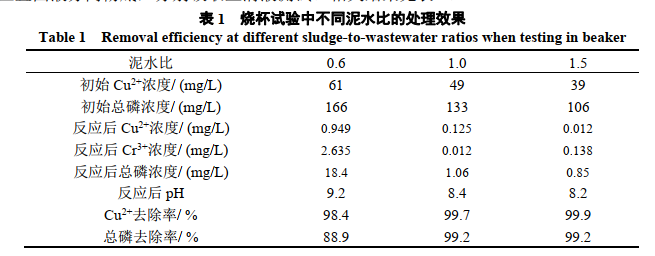 設計泥水比(特指污泥濃縮池中的氫氧化鉻污泥的體積與焦銅廢水的體積比)分別為0.6、1.0、1.5的燒杯實驗,