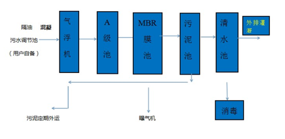 工藝流程說明:餐具清洗消毒中心廢水經(jīng)隔油池、格柵、篩網(wǎng)去除大部分油脂、固體雜物后流入調(diào)節(jié)池,調(diào)節(jié)水質(zhì)水量,然后通過加藥絮凝形成絮團(tuán),通過氣浮裝置單元分離去除污水中的絮團(tuán)和更多的浮油。經(jīng)過氣浮后的污水進(jìn)入生物膜微濾裝置,在曝氣狀態(tài)下污水與池中微生物進(jìn)行充分接觸,水中的有機(jī)污染物被微生物吸附、氧化、分解,同時(shí)由微孔濾膜組件替代沉淀池實(shí)現(xiàn)泥水分離,通過生物降解與微孔濾膜分離的共同作用,使污水中的污染物濃度大大降低,出水進(jìn)入高效過濾器,污水中的懸浮物再次經(jīng)過濾截留后排放。