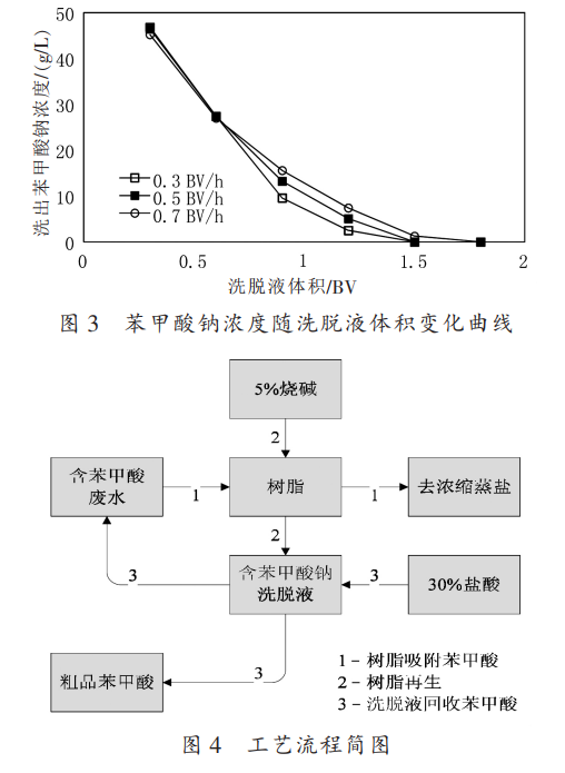 洗脫出的苯甲酸鈉再經(jīng)過(guò)加酸反調(diào)成苯甲酸,粗品苯甲酸可以從洗脫液中分離出來(lái),剩余低濃度洗脫液混入產(chǎn)品母液中一并處理。完整工藝流程圖見(jiàn)圖4。