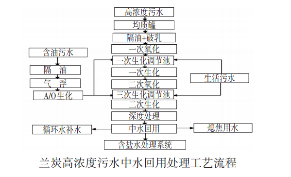 蘭炭污水來源共有4類:高濃度污水、含油污水、生產生活污水和其他裝置污水。污水的處理工藝設計在“分類收集、分質處理”基礎上,采用“預處理→一次氧化處理→一次生化處理→二次氧化處理→二次生化處理→深度處理→中水回用處理→高鹽水處理系統”工藝流程,進行污水綜合處理工藝,見下圖。