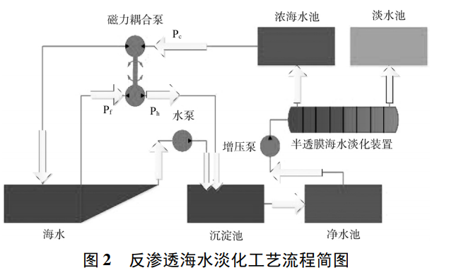 如圖2所示為應(yīng)用了余壓能磁力耦合泵裝置的反滲透海水淡化工藝流程簡(jiǎn)圖.該工藝系統(tǒng)主要包括水池、磁力耦合泵和半透膜海水淡化裝置三大部分.