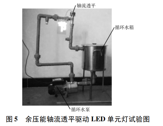 試驗(yàn)測(cè)試主要為電壓測(cè)試、電流測(cè)試和驅(qū)動(dòng)LED單元燈試驗(yàn)測(cè)試.試驗(yàn)過(guò)程中所用水泵的壓頭為22m,流量為30m3/h,模擬排水管路的余壓和流量.通過(guò)試驗(yàn)結(jié)果可以看出,模擬狀態(tài)下,軸流透平成功驅(qū)動(dòng)LED單元燈發(fā)光,其中,電壓測(cè)試為35.2V,功率為12.6W,實(shí)現(xiàn)了管路余壓能的回收.