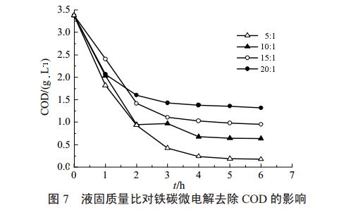 由圖7和表7可以看出,固定pH為4和鐵碳質量比為1:1時,液固質量比為5:1的COD去除效果明顯高于其他情況,6h時COD去除率已經達到90%以上。鐵碳微電解中COD去除效果和除氟性能隨液固比的增大而減小,主要原因是隨著鐵碳量的增加,單位時間內更多的廢水有機物參與反應。液固比越高,COD去除效果越好,除氟性能也相應增強。本研究中確定鐵碳微電解處理該廢水時適宜液固質量比為5:1。但實際應用中,必須考慮廢水處理成本和鐵屑板結對有機氟廢水處理的影響。