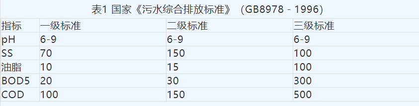 二、據(jù)對(duì)我國(guó)發(fā)達(dá)地區(qū)廣州、上海等地餐飲廢水檢測(cè)結(jié)果表明:BOD為300-500mg/L,COD為1000mg/L左右,油脂為150-421 mg/L,氨氮平均值6-50 mg/L,SS為300-568 mg/L,這些指標(biāo)均高于國(guó)家《污水綜合排放標(biāo)準(zhǔn)》(GB8978-1996)中規(guī)定的排放濃度(見(jiàn)表1),其中油脂,BOD,COD,SS要遠(yuǎn)遠(yuǎn)高于三級(jí)標(biāo)準(zhǔn),餐飲廢水在處理達(dá)到三級(jí)標(biāo)準(zhǔn)后,才能排入有污水處理廠的城市管網(wǎng)。