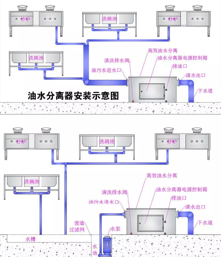 提供隔油設備進水管、出水管、通氣管、放空管、超越管與相應管道系統的接駁。通氣管應單獨接到室外。