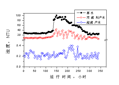 說明:超濾的降濁作用非常明顯,在雙濾料出水濁度較高、變化較大的情況下,出水濁度也非常穩定,能滿足反滲透進水濁度<1NTU的要求。