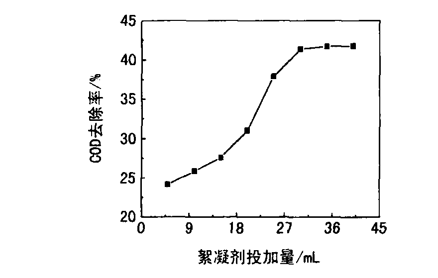 由圖可知,隨著絮凝劑投加量的增加,COD去除率逐漸升高。當投加量從20mL增加到30mL時COD去除率大幅增加;投加量大于30mL或者小于20mL時,COD去除率的增加比較緩慢。這是由于投加量低于20mL時,廢水中具有絮凝作用的基團濃度低,與污染物分子碰撞形成膠體的幾率小,絮凝效果不明顯;投加量大于30mL時,大部分能與絮凝劑作的污染物已與絮凝劑結合,再增大投加量,不再有更多的污染物沉淀。因此,退漿廢水中絮凝劑的用量以30mL(即120mL/L)較適宜,此時COD去除率為41.72%。具體參見http://m.bnynw.com更多相關技術文檔。