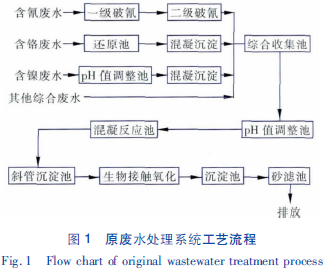 東莞市明輝五金電鍍有限公司建于1996 年7月,主要從事塑膠電鍍、五金電鍍,生產廢水包括含鎳廢水(57.68 m3/d) 、含氰廢水(26.4 m3/d) 、含鉻廢水(12.64 m3/d) 、綜合廢水(203.28 m3/d) ,總廢水量為300 m3/d。公司已建有一套廢水處理系統,采用分質分流處理的方式,工藝流程如圖1 所示。該廢水處理系統的設計處理能力為300 m3/d,出水水質執行廣東省《水污染物排放限值》(DB 44/26—2001) 的一級標準。由于東莞市要求自2012 年12月起,所有的電鍍類企業執行《電鍍污染物排放標準》(GB 21900-2008) 的表3 標準,并且廣東省要求專業電鍍企業的工業用水循環回用率達到60%以上,因此該企業需對廢水處理系統進行升級改造,一方面通過膜過濾系統保證處理出水回用率達到60%以上,另一方面通過高級氧化與生化組合工藝確保出水達標排放。
