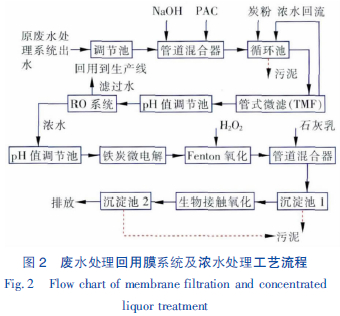 總水量的60%經RO過濾后進入清水池,然后回用到生產線; 占總水量約40%的RO濃水通過鐵炭微電解與Fenton 氧化后,再經生物接觸氧化池、沉淀處理后達標排放。
