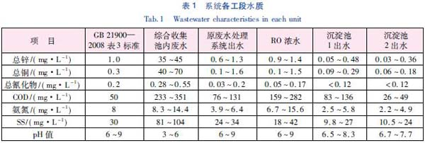 工程竣工調試后,2012 年12 月業主委托東莞市環境監測站進行驗收監測,其結果如表1 所示。原廢水處理系統采用分質分流處理,含鉻、鎳的廢水在車間或生產設施廢水排放口達到排放標準,綜合收集池之后的水質監測數據只列出要求在企業廢水總排放口達標的指標。原處理系統出水通過TMF和RO組合膜系統,60%濾過水完全可以回用到電鍍生產線。鐵炭微電解與Fenton 氧化對RO濃水COD 的去除率約50%,且B/C 值由原來約0.12 提高到約0.43,可生物降解性極大提高; 另外,經調節pH 值沉淀后,總鋅、總銅均被一定程度地降低,總氰化物則被氧化分解幾乎完全去除。生物接觸氧化池對COD 的去除率約為70%,出水COD<50 mg/L,最低甚至達26 mg/L,氨氮<5 mg/L。最終出水的各項指標均達到了GB 21900—2008 的表3 標準。
