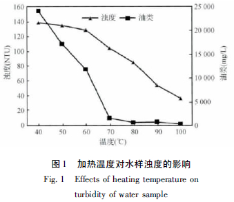 在加酸量為1.0 mL 98% H2SO4/100 mL 乳化液條件下,加酸后的乳化液在常溫狀態下仍保穩定。在加熱時間2 h 條件下,分別將加熱溫度控制在(40±1)℃、(50±1)℃、(60±1)℃、(70±1)℃、(80±1)℃、(90±1)℃、(100±1)℃,隨著加熱溫度的升高,體系穩定的乳化液逐漸出現了油水界面的分離,下層為具有一定濁度的黃色水層,中間層為灰白色的乳化劑層,上層為油層。隨著溫度的升高,水層的厚度不斷增大,油水分離效果更為明顯,在100℃處水層厚度達到最大。下層水樣測濁度發現,在40~60℃時,下層水樣濁度基本無變化且濁度較高,在70~100℃時,下層水樣濁度顯著降低,同時下層水樣測油類含量發現,在70℃前油類含量處于較高水平,但當加熱溫度大于70℃時油類含量大大降低,如圖1 所示。由此推斷,在70℃以下時加熱溫度不足以完全破壞油水界面的界面膜,使得水相中仍溶解了部分油類物質,但當加熱溫度大于70℃時,由于液珠的聚結和油相粘度的進一步降低,油水界面的界面膜強度大大降低,所以隨著溫度的提高,油水分離過程進行較快。因此,在加熱溫度100℃時,可以獲得良好的破乳效果,但是考慮到100℃時乳化液水相在沸騰過程中蒸發較快,因此將加熱溫度控制在95℃較佳。