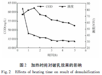 同時,測定水層COD 發現,其呈先升后降的趨勢,在0.5~1.5 h,COD 先升高,在2~5 h,逐漸下降。出現這一趨勢,可能是因為加熱酸化過程中的無機酸加入使得陰離子表面活性劑轉化為電中性的有機酸(部分能溶于水、部分不溶于水),同時乳化劑含有很多成分復雜的助劑,因此生成產物非常復雜,一部分生成物不溶于水,懸浮形成灰白色的中間層,另一部分溶于水中表現為COD,而在0.5~1.5h,加熱促進了溶于水的這部分COD 的生成,導致COD 升高,但總的來說,隨著加熱時間的增長,下層水中的油相慢慢分離溶出,使得COD 表現為下降趨勢。最后,考慮到1 h 加熱時間,已能將下層水層濁度降低到較低水平,具有較好的破乳效果,因此將加熱時間控制在1 h,以取得較低能耗。