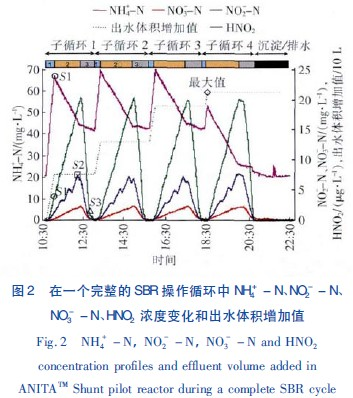 利用由UV 傳感器在線監測的NO2--N和NH4+-N 信號來控制SBR 反應器的運行。在整個試驗過程中,利用瞬時取樣分析對傳感器監測結果的準確性和可靠性進行對比和監控。當SBR 反應器中每個子循環的進水階段實測的NH4+-N和NO2--N濃度之和達到預設值(S1) 時,進水階段就會自動停止。因此,每個子循環過程中反應器的進水容積取決于進水中的NH4+-N濃度。當SBR 反應器達到最大液位時,啟動沉淀和排水過程,一個完整的SBR 循環結束。當反應器中的HNO2濃度達到預設值(S2) 時,曝氣階段(DO = 0.4~ 1.0 mg/L)自動停止,保證了在曝氣過程中由AOB 產生的N2O釋放量在可控范圍內最低。由反應器中NO2--N濃度預設值(S3) 來控制外碳源的投加,確保其投加的高效性。由NO2--N濃度控制碳源投加量的好處在于能避免過量投加,節省運行成本。根據該控制策略,絕大多數進水中的NH4+-N在曝氣階段被轉化為NO2--N,所產生的NO2--N在接下來的缺氧段被反硝化為N2,從而實現了短程硝化反硝化的在線控制(見圖2) 。