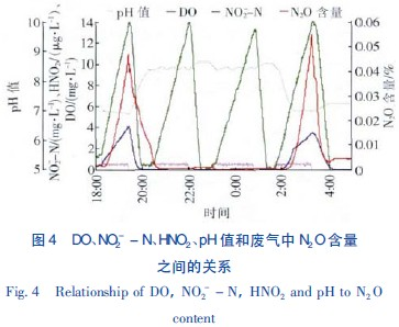 為了確定N2O 的釋放與NO2--N濃度是否直接相關,在SBR 一個完整循環的不同子循環中采用不同的pH 值,用以區別NO2--N和FNA 濃度與N2O 產生的關系。對于所有的子循環,當NO2--N為14 mg/L 時終止曝氣。控制第一個和最后一個子循環的pH 值在7.0~ 7.1 之間,當曝氣結束時這兩個子循環的NO2--N和FNA 濃度分別為14 mg/L和3.5~ 4.0 μg/L。此時,廢氣中的N2O 含量為0.045%~ 0.055%。在第二和第三個子循環中,將pH 值控制在8.4~ 8.5,曝氣結束時的NO2--N濃度也為14 mg/L,而FNA 濃度< 0.3 μg/L,在廢氣中幾乎檢測不到N2O 的存在(見圖4) 。這證明了N2O的釋放與NO2--N濃度沒有直接關系,而FNA 對N2O 的釋放起重要作用。