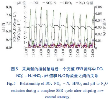 根據前述結論,在ANITATM Shunt 工藝中,采用FNA 濃度預設值而不是NO2--N濃度預設值來終止曝氣反應。在SBR循環控制中,曝氣進水階段依舊終止于(NH4+-N+NO2--N)>80 mg/L 時; 當HNO2濃度達到1.5μg/L 的預設值時終止曝氣,如圖5 所示; 乙醇投加階段和缺氧段的時長仍然由NO2--N濃度預設值來控制。在這種控制方式下,在每個曝氣階段廢氣中N2O 的含量均低于0.008%,相當于N2O 的釋放量< 0.7%。在最初的SBR 運行控制策略中,曝氣階段終止于NO2--N濃度為20 mg/L (相當于HNO2濃度為7 μg/L) 時,N2O 在廢氣中的含量超過8%。