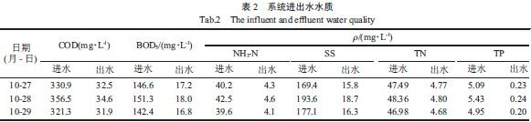 系統(tǒng)運行初期,出水水質(zhì)波動性很大,廢水水質(zhì)中有機物、氮磷含量有時候較高,主要原因是生物濾塔內(nèi)填料掛膜需要一段時間、人工濕地植物也未長成,直接影響了整個系統(tǒng)的去除效率。在整個系統(tǒng)運行1 個月后,濾塔內(nèi)生物膜已基本形成,濕地植物也慢慢長成,出水水質(zhì)趨于穩(wěn)定。出水水質(zhì)達設(shè)計要求,系統(tǒng)對COD、BOD5、NH3-N、SS、TN 和TP 的平均去除率分別為90.19%、88.19%、89.37%、90.59%、90.02%和95.67%。2012 年10 月27-29 日,系統(tǒng)進出水水質(zhì)見表2。