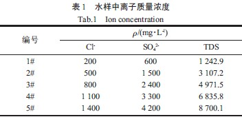 根據(jù)寧夏南部地區(qū)地下水中Cl-和SO42-的實(shí)際含量(Cl-最高質(zhì)量濃度為1 367 mg/L,SO42- 最高質(zhì)量濃度4 111.5 mg/L)配制水樣,如表1 所示。