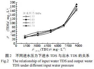 在進(jìn)水壓力分別為0.55、0.60、0.65、0.70MPa,進(jìn)水TDS 含量分別為1 242.8、3 107.2、4 971.5、6 835.8、8 700.1 mg/L 的條件下,進(jìn)行進(jìn)水壓力、進(jìn)水濃度對(duì)清水出水濃度影響的試驗(yàn)。不同進(jìn)水壓力下進(jìn)水TDS 與出水TDS 的關(guān)系如圖2 所示。