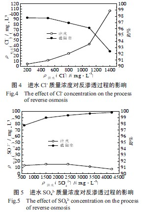 由圖4 可知,隨著Cl-進(jìn)水質(zhì)量濃度的升高,反滲透膜對(duì)于Cl-的截留率總體呈下降的趨勢(shì),但均大于92%,且出水質(zhì)量濃度均小于國(guó)家飲用水標(biāo)準(zhǔn)中對(duì)Cl-質(zhì)量濃度的要求(<50mg/L)。同時(shí)可以看出,當(dāng)Cl-進(jìn)水質(zhì)量濃度在200~1 100 mg/L 的范圍內(nèi),截留率變化不大,基本保持在96%以上,當(dāng)進(jìn)水濃度超過(guò)1 100 mg/L 時(shí),Cl-的截留率開始有明顯的下降。