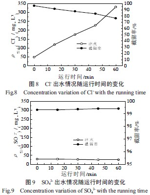 在已經(jīng)確定的最佳運(yùn)行條件下(進(jìn)水壓力0.6MPa),按照寧夏南部地區(qū)當(dāng)?shù)厮w中Cl-和SO42-的實(shí)際濃度(Cl-質(zhì)量濃度為1 400 mg/L,SO42-質(zhì)量濃度為4 200 mg/L),采用一級(jí)一段循環(huán)模式運(yùn)行反滲透裝置。每15 min 取一次樣進(jìn)行測(cè)定,運(yùn)行結(jié)果如圖8、圖9 所示。