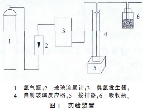 實驗在自制的透明玻璃的柱狀反應器內進行,反應器尺寸為D 50mm×100mm。將反應器置于恒溫磁力攪拌器上,使催化劑和廢水充分混合,以純氧作氣源,用流量計控制氣速,經過臭氧發生器制備臭氧,通入反應器內,由曝氣頭作氣體分布器進行布氣,用碘化鉀溶液吸收。實驗裝置如圖1 所示。