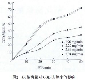 O3的輸出量對處理效果有重要影響。控制發生器使O3輸出量分別為1.96、2.29、2.61、2.94mg/min,催化劑的投加質量為3.6g,不調節廢水pH,總反應時間為50min,每隔10min取1 次樣,分別測定其COD,計算COD 的去除率,結果見圖2。