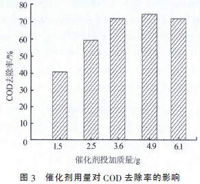 由圖3 可知,開始隨著催化劑用量的增加,COD的去除率逐漸增大,并在4.9g時達到最大,為74.87%,繼續增加催化劑的用量時,COD 的去除率反而減小。當催化劑用量較少時,催化反應的活性點較少,吸附臭氧和反應物的量也少,致使處理效果不明顯;隨著催化劑用量的增加,催化反應的活性點增多,吸附臭氧和反應物的量也相應增多,COD 的去除率逐漸增大,處理效果明顯;但隨著催化劑用量的繼續增大,催化劑顆粒越來越多,臭氧在廢水中的小氣泡間凝聚匯集,導致傳質速率下降,影響了臭氧和反應物的反應速率,致使COD 的去除率減小,處理效果下降。因此本實驗催化劑的合適投加質量為4.9g。