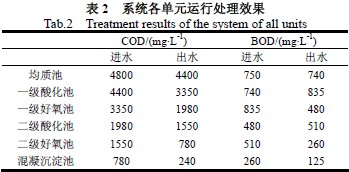 (2)廢水處理系統的COD 去除率高達95 %,耐沖擊負荷能力強,生化處理單元運行效果穩定。