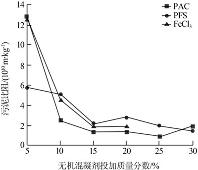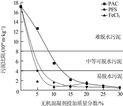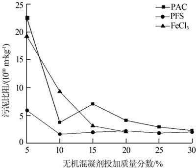 從圖 1可以看出,用3種混凝劑調(diào)理污泥后,污泥的SRF均大幅降低,3種無機混凝劑對污泥的調(diào)理效果順序為FeCl3>PFS>PAC。
