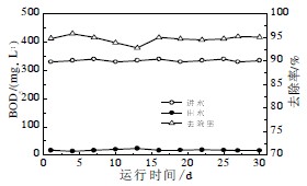 穩定運行階段反應器中進出水BOD5的去除效果如圖3 所示。由圖3 可知,出水BOD5一直處于20mg/L 以下,去除率達到90%以上。該電廠生活污水具有良好的可生化性,平均BOD5/COD 比值到了0.37,能夠有效滿足微生物生長對營養物質的需要,有利于好氧微生物快速降解水體中BOD5。