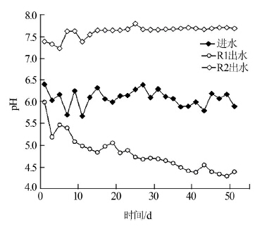 (3)中間調(diào)節(jié)槽為底部呈錐角65°的倒扣錐形、容積20 L的自制水槽,調(diào)節(jié)進(jìn)入R2反應(yīng)器的廢水pH。需定期排出沉淀在底部的從R1洗出的污泥。
