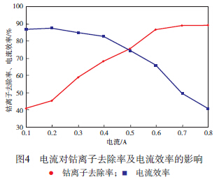 以網狀Ti/RuO2為陽極、不銹鋼板為陰極并作為主電極、填充材料為第三極,設定極間距5 cm、電解時間60 min,在填充材料為空心鋼球、電流為0.6 A、填充比為2.5、不調節(jié)廢水pH的條件下處理鈷離子質量濃度為112.3 mg/L的廢水,鈷離子去除率可達85.6%、電流效率為68.3%。本工作主要針對鈷廢水中鈷的回收再利用,電解處理后廢水中鈷離子的含量并沒有達到相關的國家或行業(yè)標準,需進一步處理。